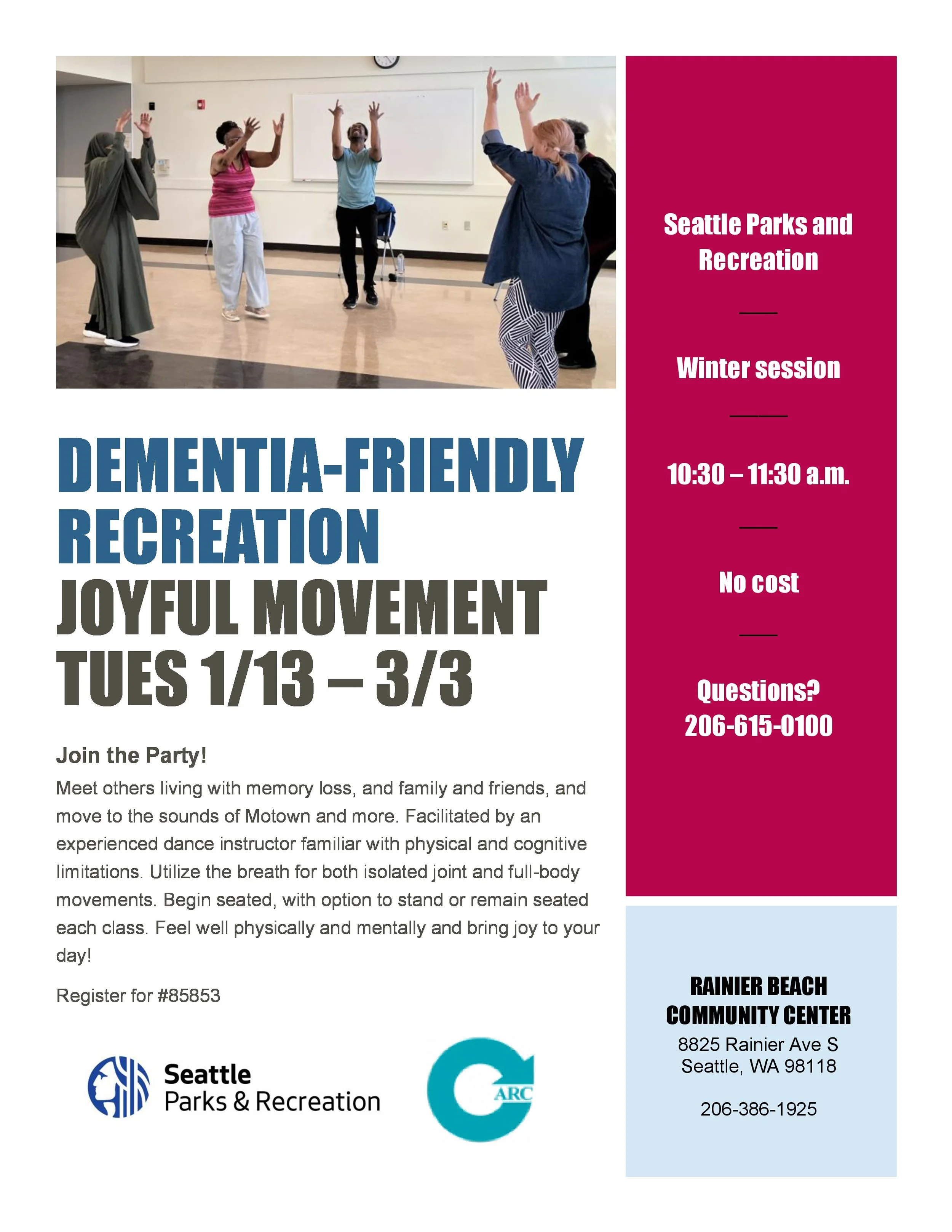 A conversation with the Dementia-Friendly Recreation Specialist is required for 1st time participants. Please contact tamara.keefe@seattle.gov to schedule. Register seasonally through Seattle Parks and Recreation. No cost to attend.